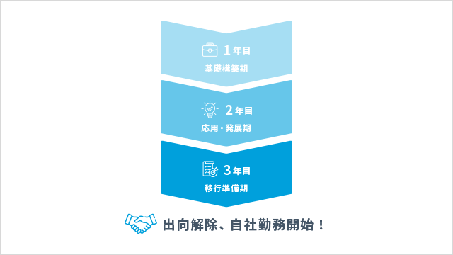 ③企業の体制構築:出向社員との定期面談へのご同席や定期報告など、弊社のマネジメントノウハウの共有を通じて出向期間終了後の受け入れ体制構築の一助としていただきます。